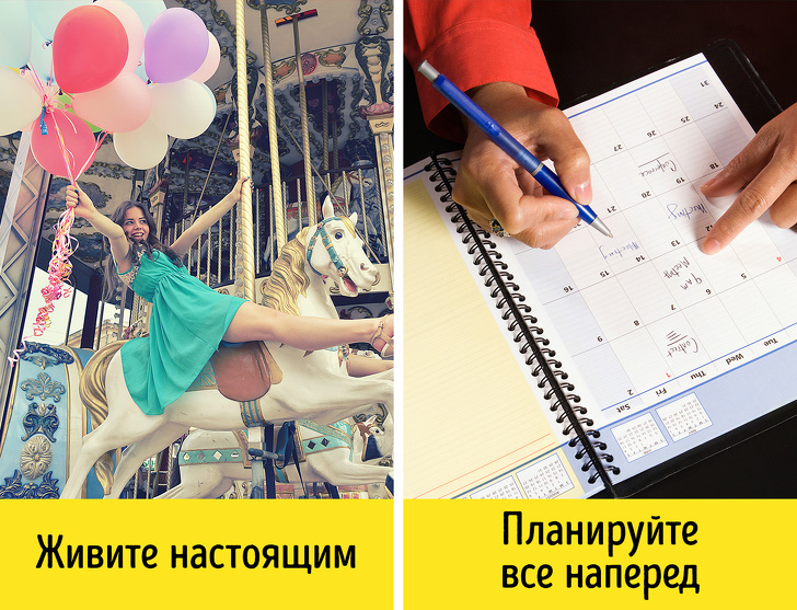 Тайм-менеджмент і системи планування надійно зайняли лідируючі місця в теоріях про поліпшення якості життя. Якщо хочете добитися вражаючих результатів, ставте конкретні цілі і розписуйте шляхи їх досягнення. Але по дорозі не забувайте насолоджуватися кожною миттю життя, нічого не загадуючи наперед. Як би ви вчинили, якби цей день був останнім?