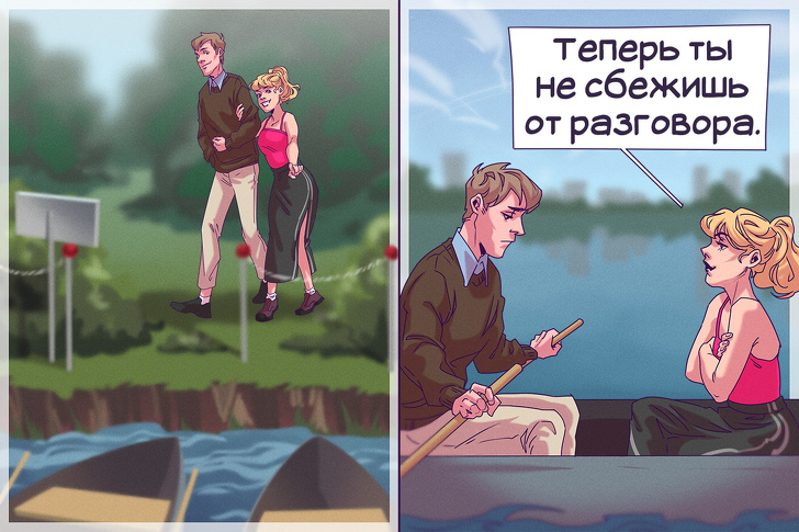 14. Якщо чоловік постійно ухиляється від важливої бесіди, то відведіть його в парк з озером, запропонуйте покататися на човні і дочекайтеся, поки отплывете на достатню відстань від берега