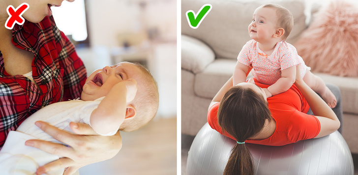 Якщо ваш малюк не бажає колихати в колясці або ліжечку, а на руках його довго качати неможливо або просто важко, спробуйте заколисати малюка на фітболі. Візьміть дитину на руки, сідайте разом з ним на м'яч. Можна тримати дитину на руках або ж, не змінюючи положення рук, опустити на коліна, щоб його вага припав на ваші ноги, а не на руки, які швидко втомлюються. І починайте легко підстрибувати на фітболі. Темп і висоту можна підібрати досвідченим шляхом.