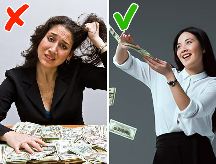 - Міняємо установку. Негативне ставлення до грошей не призведе до заможності. Перевірте себе. Чи думаєте ви, що гроші — це погано? Всі негативні установки замініть на одну, але позитивну: ви гідні багатства. «Я гідна / гідний» — найсильніша думка, яку потрібно повторювати собі кожен день, щоб перестати боятися грошей.