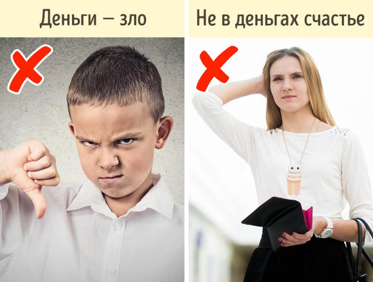 - Обітниці бідності. Багатьом людям з дитинства закладаються в голову негативні установки щодо грошей: «Гроші — це зло»; «Не жили заможно, годі й починати»; «Гроші псують людей»; «Не в грошах щастя».