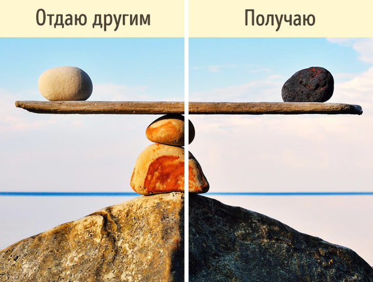 - Баланс. Коли ви отримуєте користь від інших і не забуваєте віддавати натомість, коли немає перекосу в одну або іншу сторону, все в житті знаходиться в балансі і гармонії. Дисбаланс ж сильно відбивається на почутті власної гідності та усвідомлення своєї значущості.