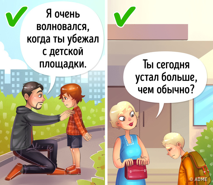 - Якщо дитина зробила щось небажане, дайте коментар вчинку і вашим почуттям. Наприклад: «Я хвилююся, коли ти не береш трубку» замість: «Ти жахливо себе ведеш».