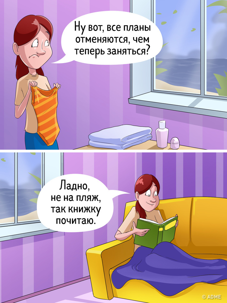 Вам не подобається, коли ваші плани несподівано рушаться ( хоча кому, звичайно, таке може сподобатися), але саме у інтровертів різкі зміни викликають сильний стрес. Щоб уникнути такого хвилювання, краще мати кілька варіантів на всякий випадок. Якщо у вас в голові будуть визначені сценарії на випадок непередбачених обставин, то й ступінь тривоги значно зменшиться. А так як вміння планувати і аналізувати — один з ваших ковзанів, то ви будете захищені від непередбачених обставин. Цей прийом добре допомагає розвинути гнучкість і швидко адаптуватися до будь-яких змін.
