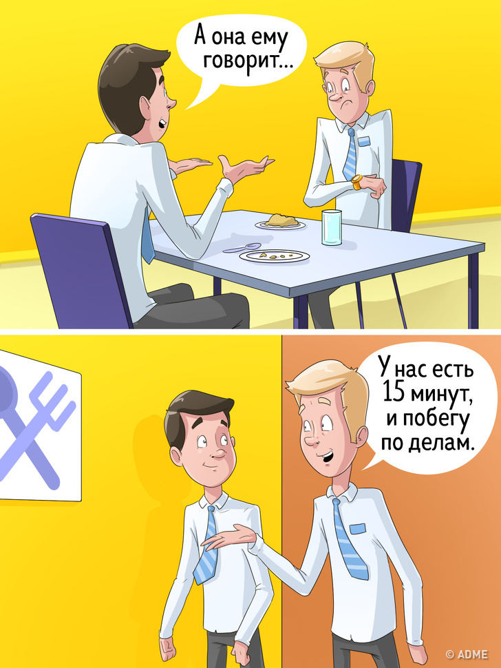 Збудуйте свої кордони так, щоб спілкування замість стомлення приносило радість. І якщо вам здається, що співрозмовник ніколи не зупиниться, то у ваших силах запобігти цю ситуацію, чітко визначивши той час, який ви можете приділити йому. Причому цей прийом діє як на роботі, так і з друзями та знайомими. Також цього правила можна дотримуватися не тільки в розмові, але і при відвідуванні будь-якого заходу. Дайте собі певний час, яке ви точно будете присутні (наприклад, 30 хвилин на вечірці), і після закінчення оного коректно віддалитися. Так ви захистите себе від вигорання і втоми.