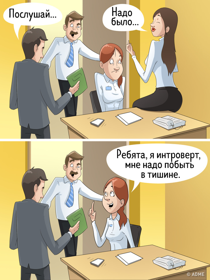 Для того щоб уникнути непорозумінь на роботі і в житті, психологи рекомендують заздалегідь розповісти про те, що ви іноді можете «зависати» або не підтримувати бесіду. І все це відбувається не тому, що ви не бажаєте спілкуватися, а в силу специфіки вашого психотипу. Чесність — наше все. І люди будуть розуміти, що ви не зі зла, і вам стане набагато комфортніше тому, що зникла потреба носити маску .
