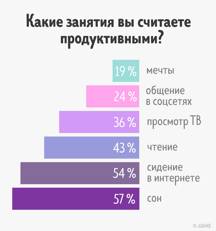 Такі заняття, як сон, сидіння в інтернеті, перегляд ТБ і мріяння, більше не вважаються непотрібними, навпаки, опитані вважають їх важливими і продуктивними. 50 хвилин в день — це середній час, який користувачі проводять в фейсбуці і инстаграме.