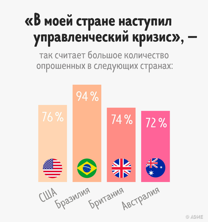 «Моя країна переживає кризу ідентичності», — у цьому впевнені більше 78 % опитаних бразильців, 72 % американців, 67 % британців, 58 % німців.