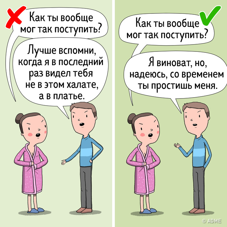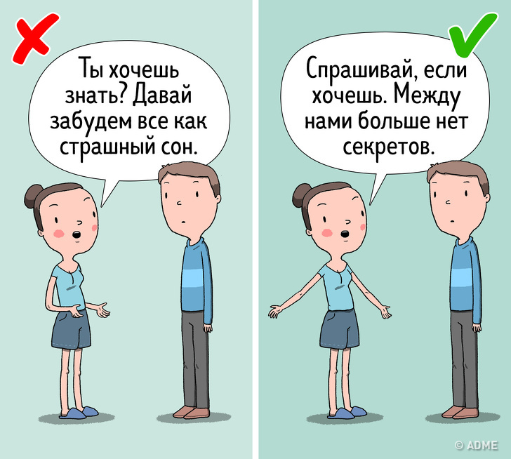 Хороше рішення в цьому випадку — залишатися спокійним і прямо сказати партнерові, що ви готові спокутувати провину, але постійні докори і згадки про неї не допоможуть у цьому.