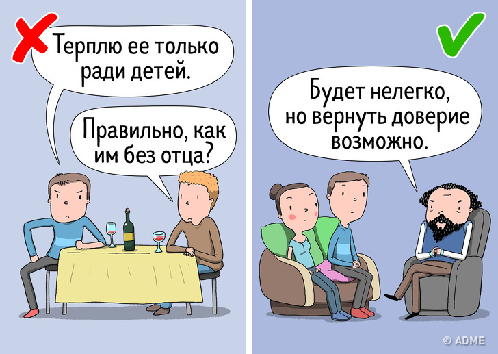 Рішення залишитися разом після зради брали ви обидва, і відповідальність за це лежить тільки на вас двох. Саме тому ви не повинні втягувати в процес з'ясування відносин інших людей, будь то друзі, родичі або ваші власні діти.