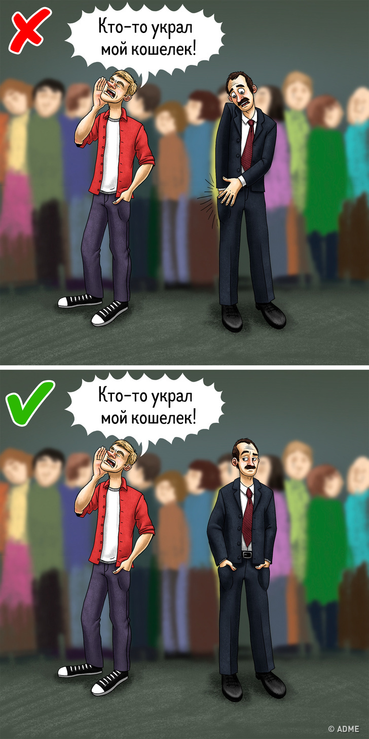 Іноді на станції метро можна почути крик: «Хто вкрав мій гаманець!» Після таких слів все починають дивитися, чи на місці їх цінні речі: перевіряють гаманці, мацають кишені. Ця хитрість допомагає злодіям точно визначити, де знаходяться ваші гроші. Тому варто реагувати на подібні вскрикивания спокійно, щоб комп не визначив місце розташування вашого гаманця та інших цінних речей.