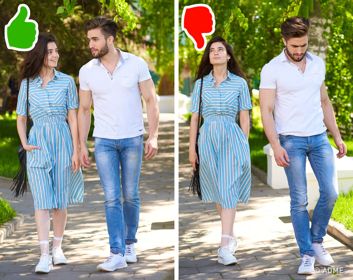 Припустимо, ви вирішили прогулятися в парку: варто звернути увагу і на те, як ви будете йти. Ви йдете в одну лінію і досить близько, корпус тіла співрозмовника розгорнутий у вашу сторону, а ваші руки ледь-ледь торкаються? Побачення йде на ура, і симпатія між вами очевидна.