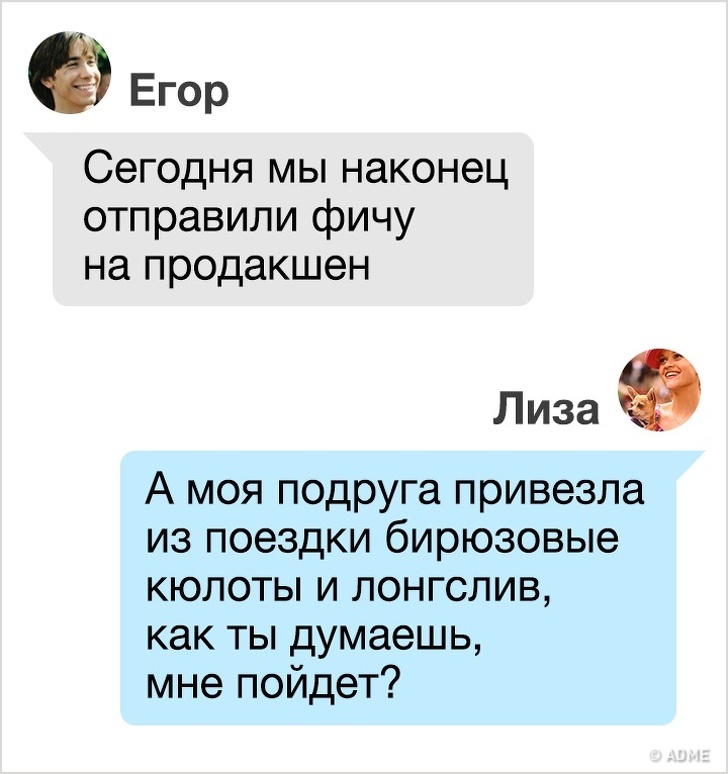 Якщо почати розмовляти на «робочому мовою» в колі родичів, вони мало що зрозуміють і будуть дратуватися, тому що перша реакція людей на невідоме — ворожість. Ці правила поширюються і на онлайн-листування. Не варто писати дівчині: «Сьогодні знову весь день чекапил баги, кастомер квапить нас з релізом», якщо вона, що називається, не в темі. А дівчині немає сенсу відправляти повідомлення хлопцеві в дусі: «Я знайшла на сэйле лілові кафи і такого ж кольору ромпер, як ти думаєш, мені піде?» Будьте тактовніше, приймайте до уваги стиль спілкування і сферу знань свого співрозмовника.