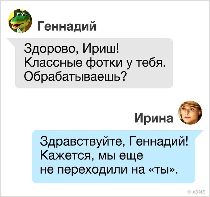 Важливо відчувати різницю між проявом безцеремонності до нових знайомих в мережі і спілкуванням на короткій нозі з давнім другом чи колегою. А якщо ваша переписка почалася з людиною з іншої країни, дізнайтеся заздалегідь про нюанси спілкування тим більше! Наприклад, у Польщі культурне звернення до чоловікові або жінці буде починатися зі слів «пан» і «пані» — аналог нашого «ви».