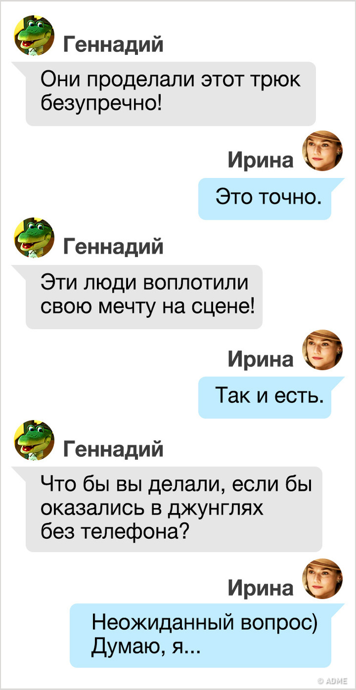 Не бійтеся імпровізувати: іноді несподіване запитання може допомогти дізнатися про людину більше, ніж тижнева листування в одноманітному режимі. Але дотримуйтесь правил пристойності: несподіваний питання не повинно збентежити, налякати або розчарувати співрозмовника.