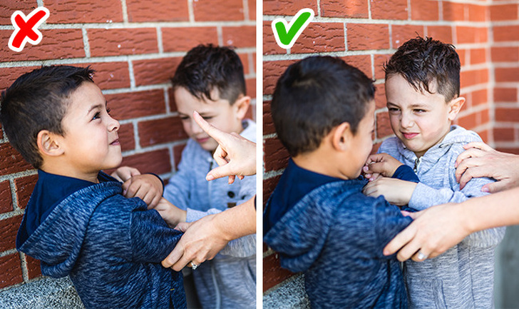 Не займайте чию-небудь сторону і не з'ясовуйте, хто призвідник конфлікту. Не варто обопільно карати дітей у конфліктах, якщо не існує загрози життю і здоров'ю. В останньому випадку слід розборонити дітей і розвести по різні боки, щоб вони охололи. В інших ситуаціях краще і зовсім зберігати нейтралітет. Приймайте і розумійте почуття і погляди обох, допомагайте їм донести їх один до одного.