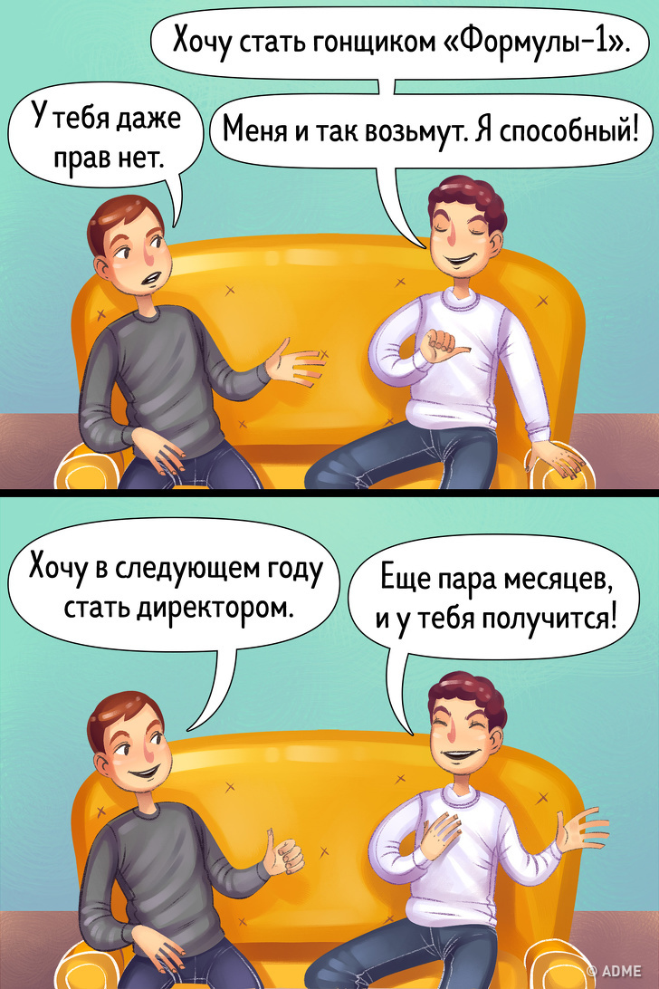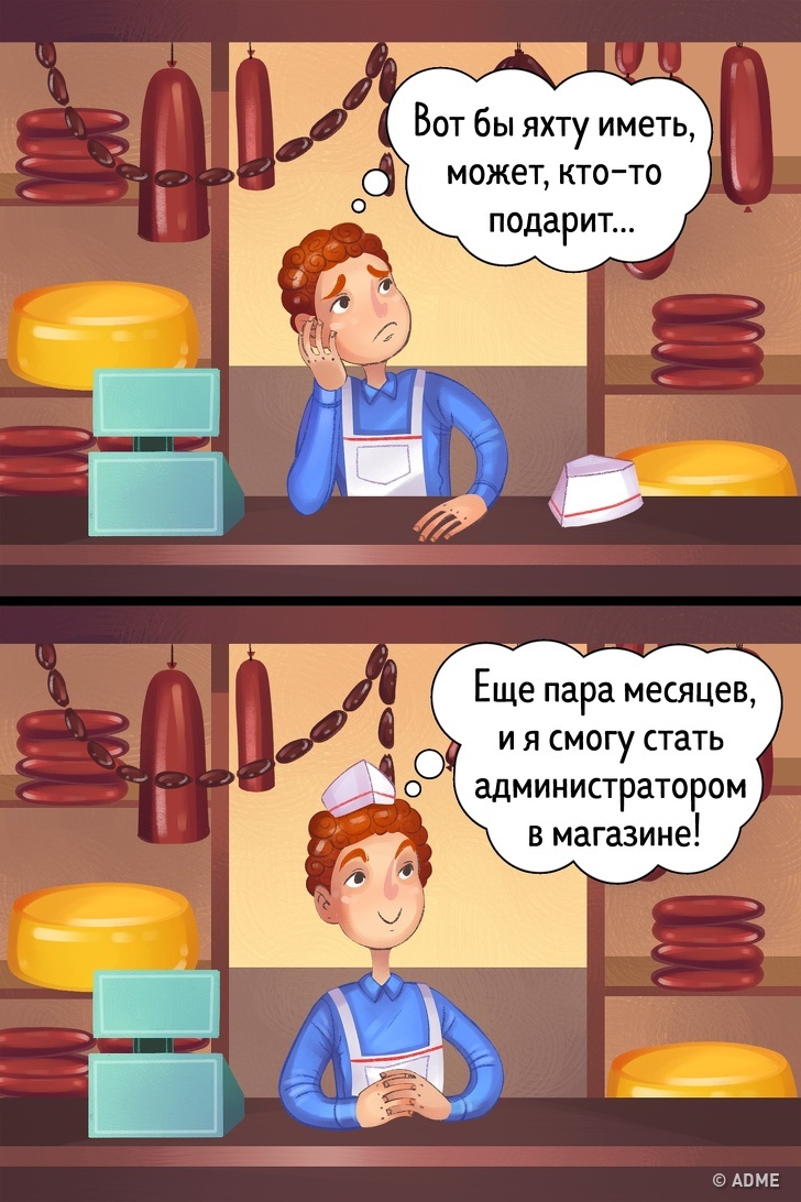 Мрії можуть перетворюватися в цілі. Але мети необхідно правильно формулювати: ви повинні розуміти, які у вас є ресурси для їх досягнення, скільки буде потрібно часу і, найважливіше, наскільки це реально. Для цього вам знадобиться методика SMART, яка допоможе проаналізувати обрану ціль. І навіть якщо ви поставили собі не зовсім реальну мету, потрібно подумати і зізнатися собі, що ви промахнулися і сформулювати її по-іншому, або розділити на підцілі.