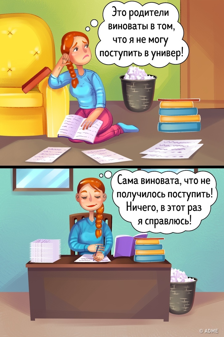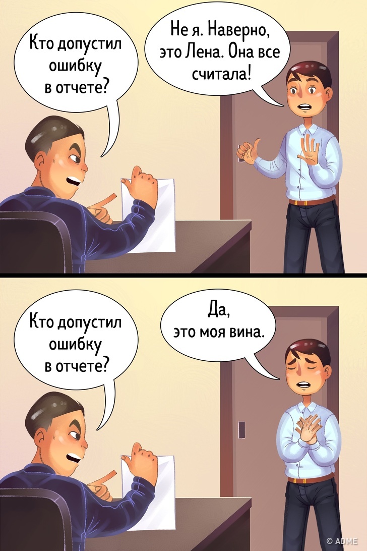 Не кожна подія в нашому житті — це наша вина, але все це наша відповідальність. Звинувачення у бік когось іншого чи обставин нічого не змінять. Адже приймаючи на себе всю відповідальність за ситуацію, що ви будуєте своє майбутнє. Вміння визнавати свої помилки і виправляти їх — перша сходинка на шляху до успіху. Просто візьміть на себе відповідальність і всупереч всьому втілити ідею в життя.