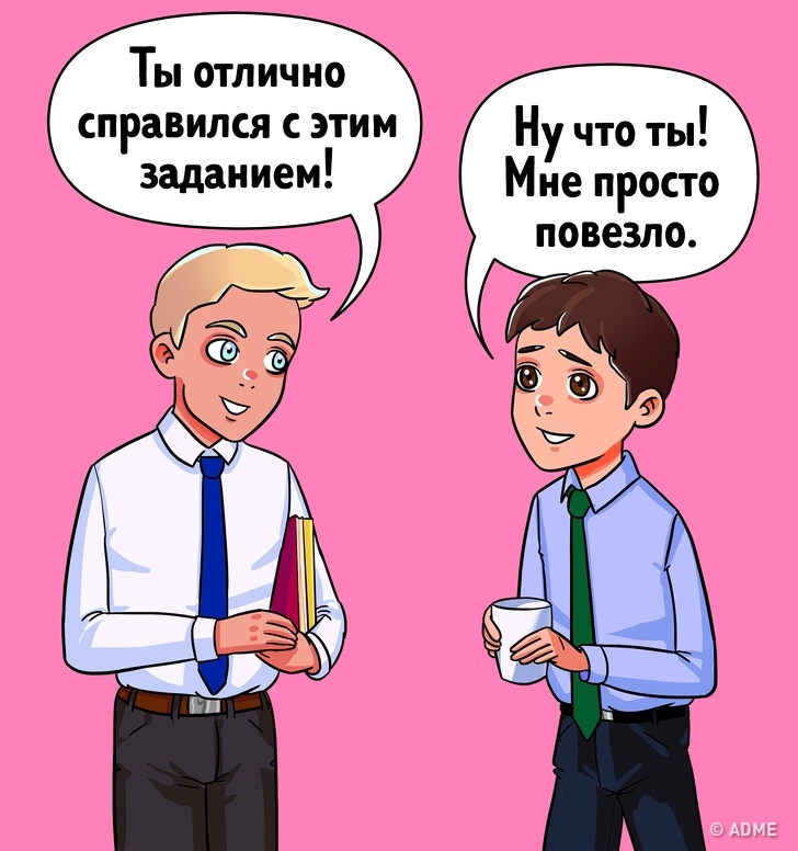 І найголовніше — поділіться своїми переживаннями з іншими людьми, і ви зрозумієте, що ви зовсім не самозванець. Вважається, що від подібних думок час від часу страждав сам Альберт Ейнштейн. Коли ви дізнаєтеся, що інші люди (особливо ті, якими ви захоплюєтеся) теж час від часу відчувають подібне стан, ви зможете переосмислити свої страхи і вам буде набагато легше від них позбутися.