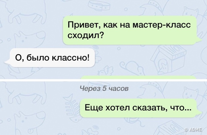 Так що не варто шукати виправдань висить непрочитаним годинами і цілодобово «меседжу». Миттєві відповіді — ознака того, що співрозмовника або співрозмовницю виділяють серед інших.