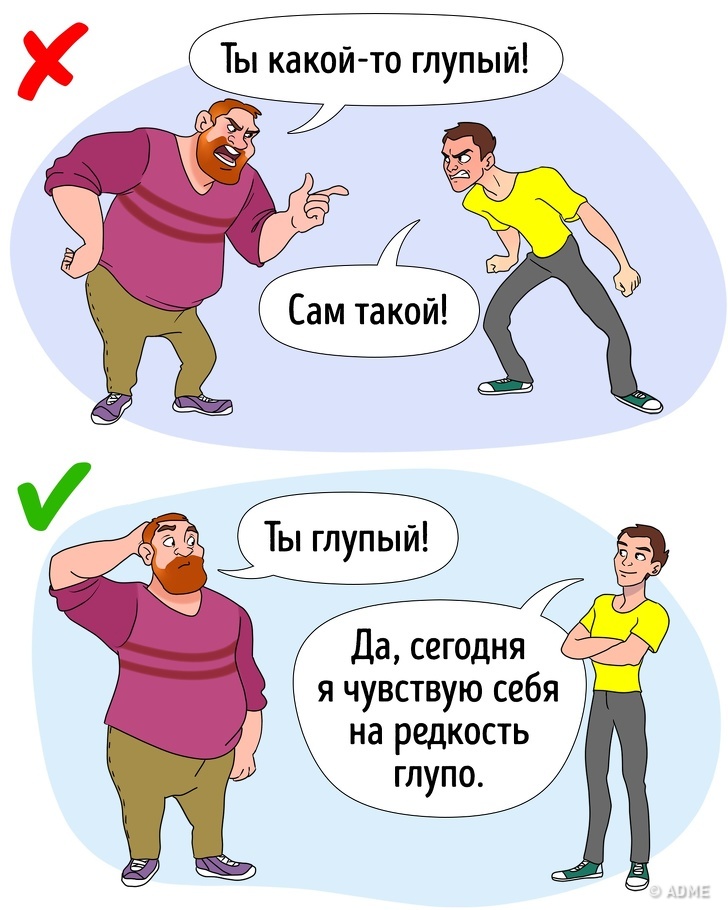 Якщо опонент звинувачує вас, погодьтеся з його твердженням. Пара-трійка ухилень — і противник дезорієнтований, адже від цього конфлікту він не отримав очікуваних емоцій.