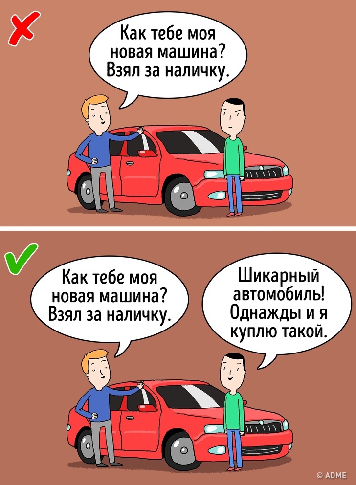 Навряд чи можна назвати щасливою людину, чиє настрій і самооцінка залежать від того, як він виглядає на тлі інших. Треба вміти радіти навіть самим маленьким перемогам і успіхам і не дозволяти думку з боку затьмарювати вашу радість. Точка зору оточуючих суб'єктивна і не може говорити про реальний стан речей.