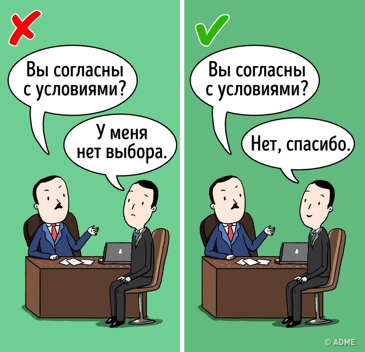 Знайте собі ціну. Не погоджуйтеся з тим, що вам не подобається. В іншому випадку люди стануть користуватися вашою безвідмовністю, а ви будете почувати себе не на своєму місці.