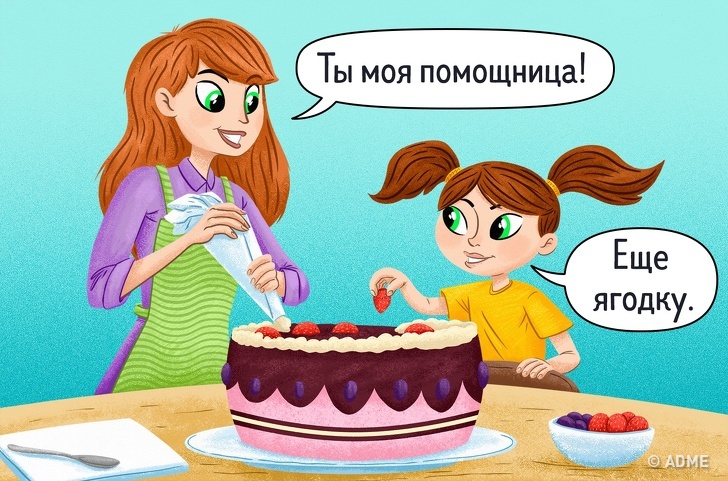 Маленьким дітям дуже цікаво брати участь у справах батьків. Не отстраняйте їх від допомоги — так ви не тільки підвищите рівень знань і умінь вашої дитини, але і напевно знайдете в його особі вірного помічника. Увімкніть його в звичне життя сім'ї, робіть свої справи разом з ним. Нехай тато візьме сина в гараж, а мама спече з донькою торт до сімейного свята.