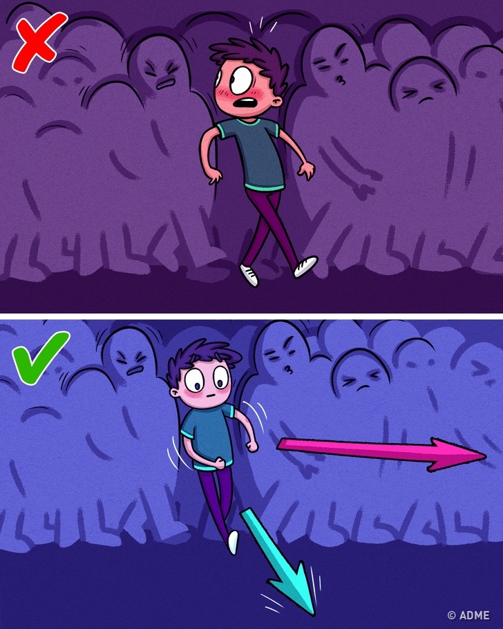 У панікуючої натовпі може початися така тиснява, що буде буквально нічим дихати. І серед людей, які люто намагаються покинути приміщення, можна отримати безліч каліцтв. Потрібно «створити» трохи простору, щоб убезпечити себе по периметру. Зігніть руки в ліктях, утворюючи зону безпеки, в яку не зможуть проникнути люди з натовпу.