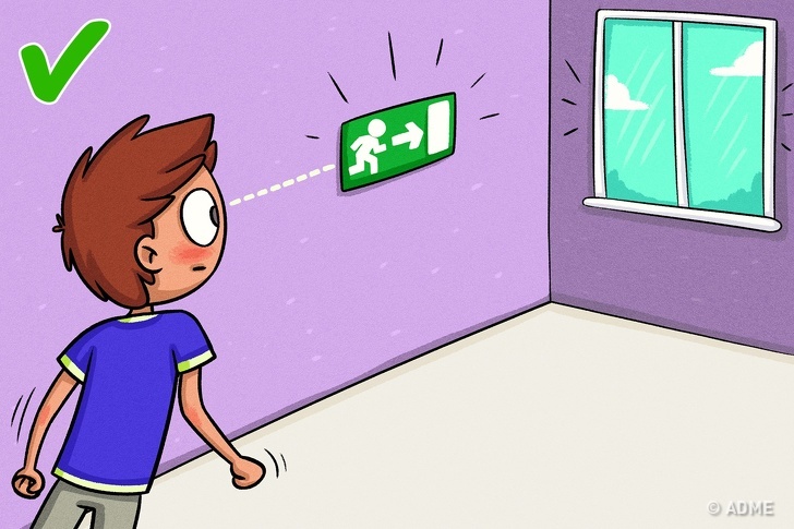 По техніці безпеки в громадських місцях на видному місці повинен розташовуватися план евакуації. Коли ви відвідуєте місця з великою кількістю людей, в першу чергу з'ясуйте, де знаходяться евакуаційні виходи. Вивчіть простір, запам'ятайте, де знаходяться пожежні виходи, і зверніть увагу на альтернативні способи евакуації, наприклад вікна.