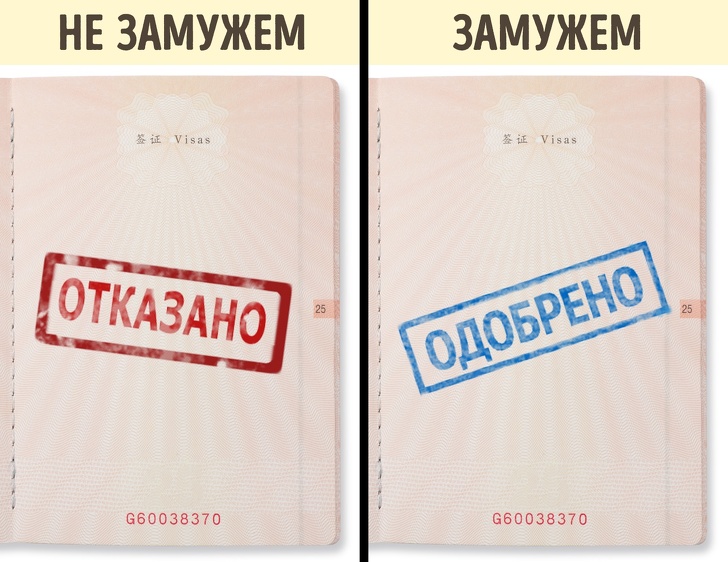 Те, що незаміжнім дівчатам не дають візи в східні країни, такі як ОАЕ або Йорданія, — це, зрозуміло, міф. Проте хоч такого правила немає, штамп у паспорті у будь-якому разі істотно збільшує шанси на видачу візи в будь-яку країну. Людина, яка перебуває в шлюбі, викликає більшу довіру у посольстві. Навряд чи одружений чоловік несподівано захоче залишитися в країні, куди приїхав як турист, якщо вдома його чекає сім'я.