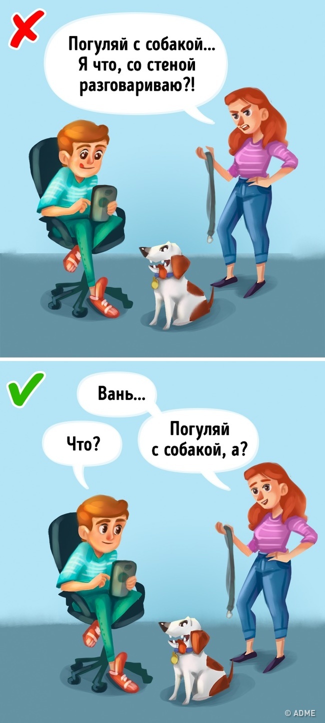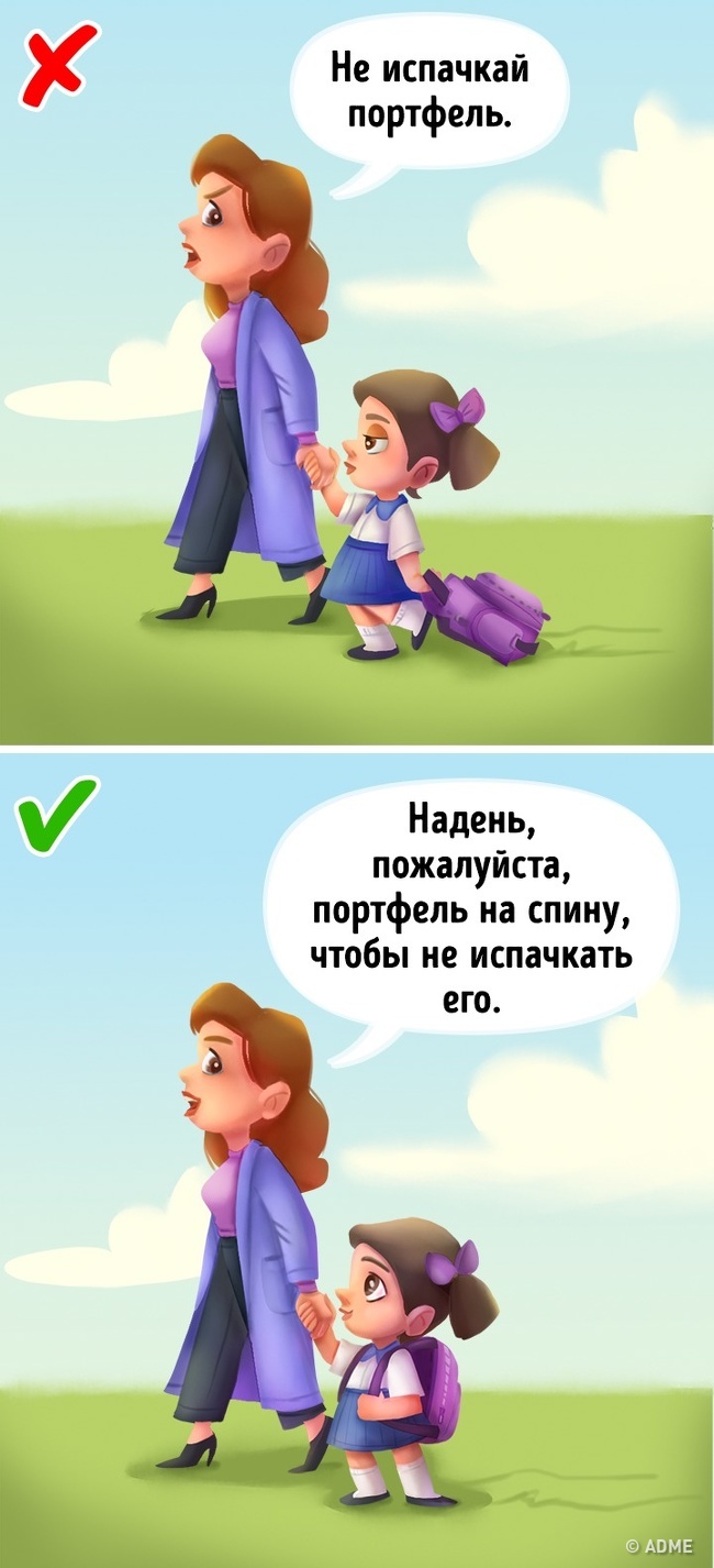 Тому замість абстрактної прохання з «не», наприклад: «не впусти», «не впади», «не розбий» — сформулюйте прохання-дію, наприклад: «тримай міцніше», «зав'яжи шнурки, щоб не впасти», «грай з м'ячем подалі від вікна».