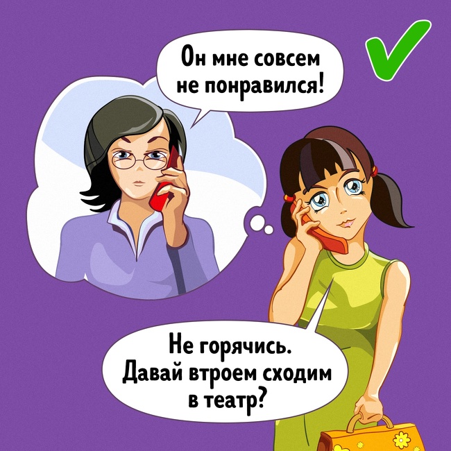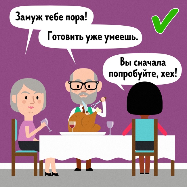 - Міняйте стиль спілкування. Не підтримуйте заїжджені розмови на теми, які вам неприємні: шлюб, народження дітей і т. д. Шукайте нові теми.