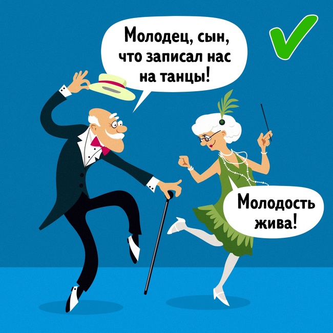 Чому вони запитують? На жаль, наше суспільство пропонує людям пенсійного віку в основному лише роль бабусі і дідусі. Згідно з дослідженням соціолога Анни Шадріної, «жінки, у яких з тих чи інших причин немає онуків, відчувають почуття провини, ніби не справляються з поставленим перед ними життєвим завданням». До того ж батьки хочуть няньчити онуків, коли вони ще бадьорі, а не коли вони вже немічні люди похилого віку. Про це нагадує клінічний психолог Патрік Джей Макграт. Покажіть своїм батькам, що заповнити життєву порожнечу можна не тільки онуками. Допоможуть поїздки в нові місця, абонемент на йогу або в танцювальний клуб «для тих, кому за...».