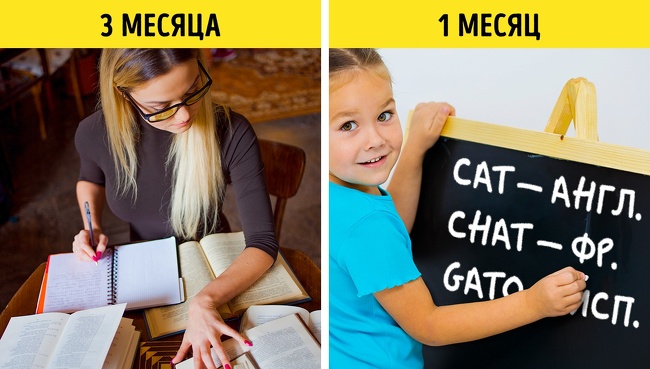 Вивчення мов дається дітям з легкістю, тоді як дорослі витрачають на це набагато більше зусиль. Лінгвіст Ноам Хомський пояснює цей факт тим, що мозок людини вбудований так званий загальний інструмент, який пов'язує синтаксичні правила для всіх існуючих мов. Більш того, за сприйняття і відтворення мовлення дитини відповідають мільйони клітин, які містяться в мозку, тому під час вивчення мови дитина встановлює асоціативні зв'язки на нейронному рівні, які утворюють складні провадять системи. Такі системи остаточно формуються до 10 років. Тому оволодіти іноземною мовою з віком стає набагато складніше і витратніше по часу.