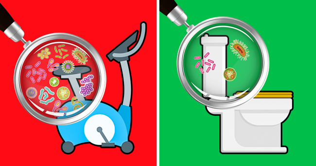 Команда фітнес-порталу Fitrated.com провела власне дослідження і з'ясувала, що ризик підчепити інфекцію в спортзалі набагато вище, ніж в громадському туалеті: на тренажерах ними було виявлено в 362 рази більше мікробів, ніж на сидінні унітазу вуличного туалету. При цьому понад 70 % бактерій виявилися потенційно небезпечними для людини: вони легко можуть викликати застуду або шкірні захворювання. Найбільш «мікробними» у фітнес-клубі виявилися велотренажери, бігові доріжки. Фахівці рекомендують дотримуватися елементарних правил безпеки: протирати тренажери антибактеріальної серветкою, не чіпати руками обличчя і не ходити босоніж в роздягальні або душі.