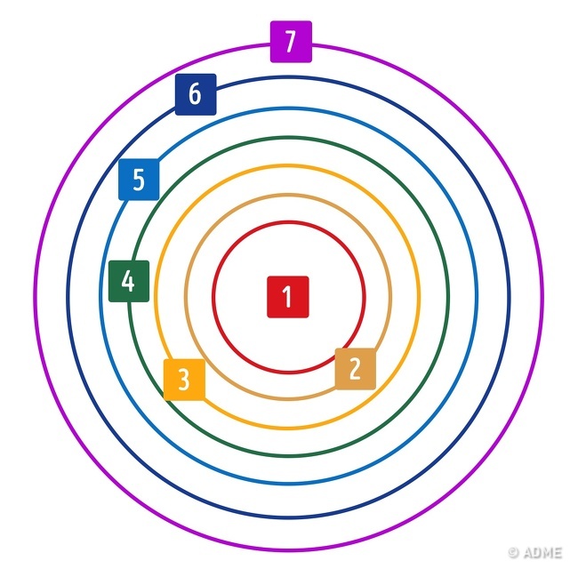 Всередині кіл «розмістіть» всіх і все те, що вам близьке. Вам потрібно уявити своє життя і виходячи з цього вписати в коло по одному пункту. Залежно від ступеня значущості для вас там можуть бути інші люди, речі, робота, захоплення. В 1-му колі — найважливіші, в 7-м — найменш важливі.