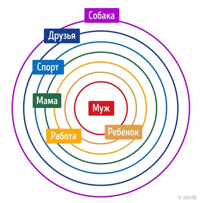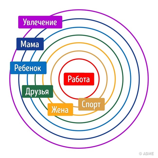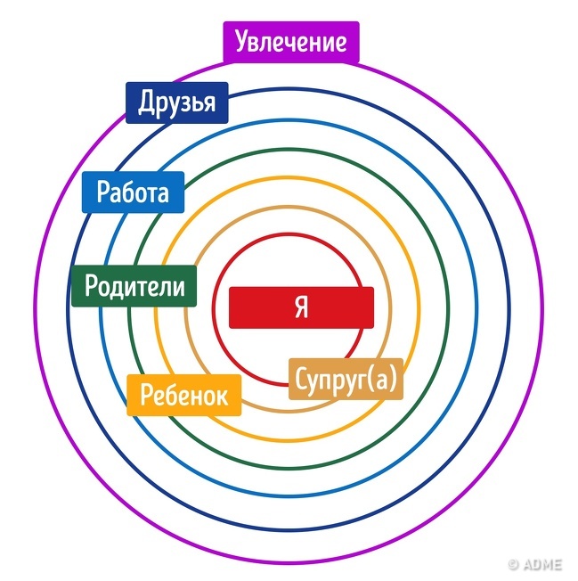 - 5-й, 6-й, 7-й кола: в цих колах можуть бути родичі, друзі, робота, хобі, домашні вихованці і ще безліч інших складових, якими заповнена ваше життя.