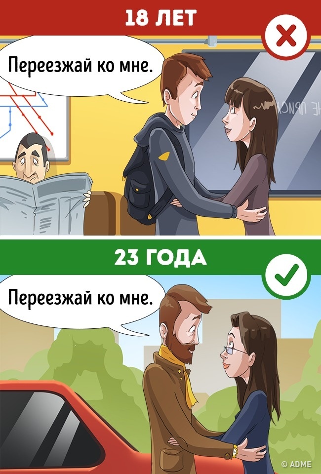 Тому, якщо чоловік пропонує вам жити під одним дахом до весілля в 18 років, це не дуже гарна ідея. Швидше за все, співжиття закінчиться нічим або розлученням. Якщо ж пропозиція надходить пізніше хоча б років на 5, ймовірно, воно більш обдумане, а партнер в майбутньому стане гарним чоловіком.