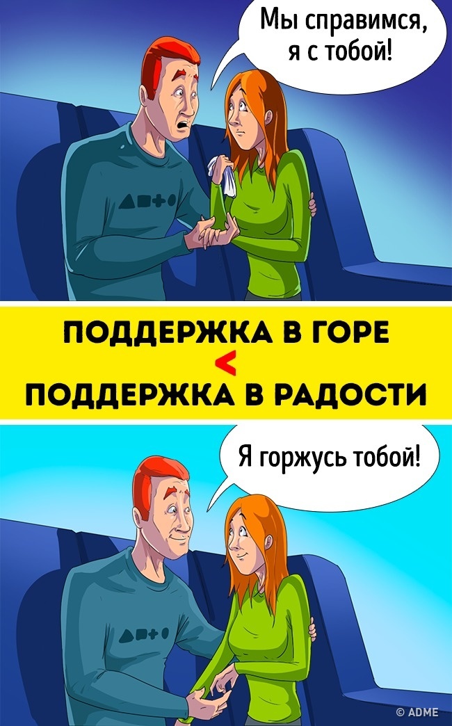 Доктор філософії, професор психології Каліфорнійського університету Шеллі Гейбл в результаті свого дослідження встановила, що для партнера підтримка після успіхів важливіше, ніж підтримка після поразок.