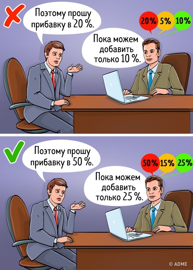 Якщо вам хотілося б збільшення зарплати на 25 %, почніть діалог з обговорення 50%-ї надбавки. Тоді 25 % будуть сприйматися більш спокійно.