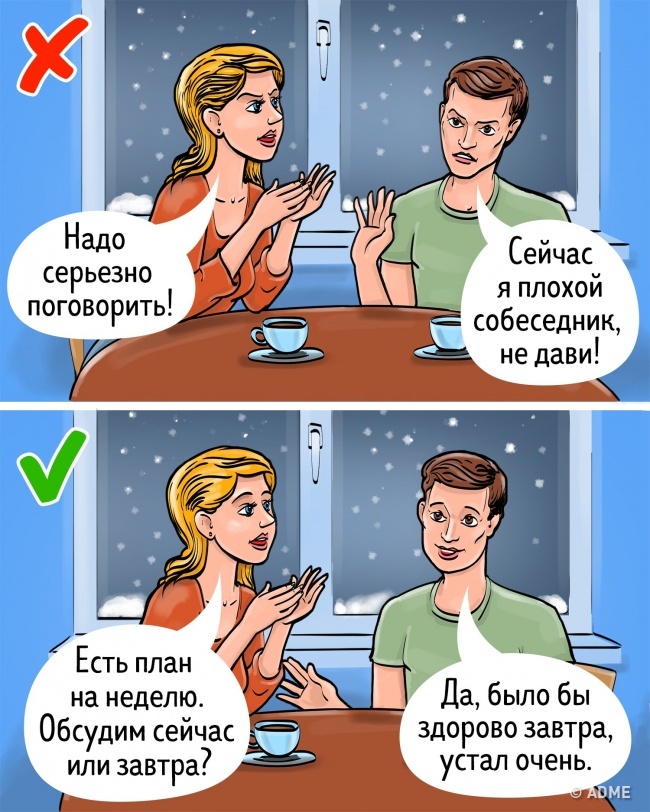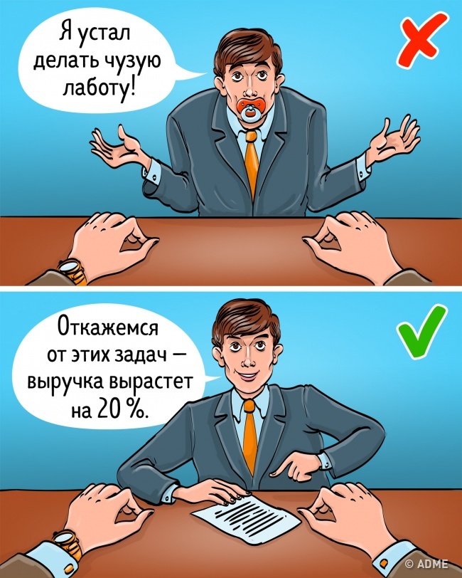 Що робити: Запитати себе, що це дасть іншій людині. Якщо вас не будуть довантажувати чужою роботою, ви будете працювати більш ефективно і закриєте річний план вдвічі швидше. Якщо чоловік виділить один «тільки ваш» день, ви перестанете жити в обуренні і пиляти його. Якщо керівник вам підвищить зарплату — ви будете мотивовані закрити ще більше крутих проектів у поточному році. Потрібно обов'язково врахувати інтереси другої сторони.