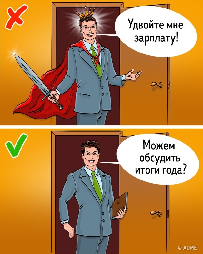 Що робити: Підготувати доказову базу. Вам потрібно уявити майбутній діалог і передбачити, з яких причин співрозмовник відповість вам «ні». Уявімо ситуацію: ви хочете підвищення і впевнені, що заслужили його. В вашу користь говорять річні звіти, успішно реалізовані проекти та захоплені відгуки клієнтів.