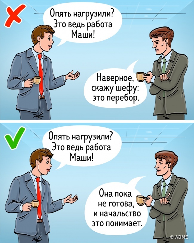 - відмовлятися від навантаження на роботі під девізом «Ви мені за це не платіть!»;