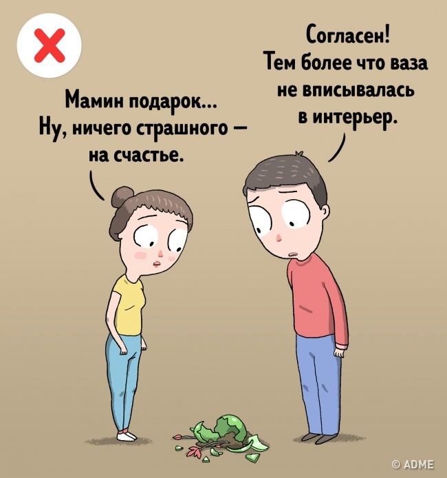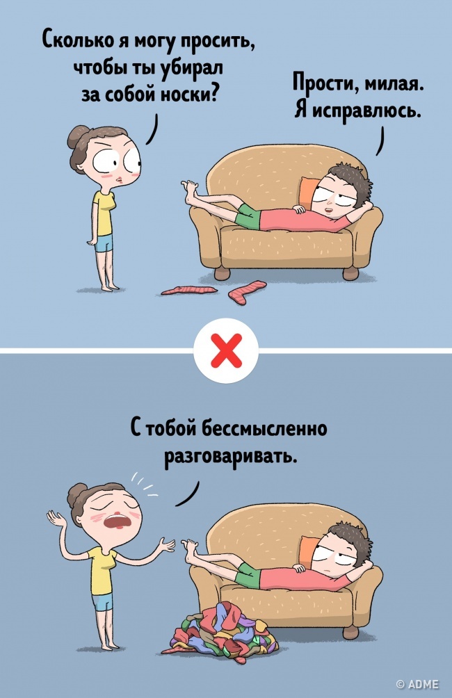 За спробою перевести все в жарт може стояти бажання розрядити напругу, що створилося у відносинах, але, як правило, гумор у подібних ситуаціях виглядає недоречно і знущально. Краще приберегти жарти і гумор для більш підходящих моментів.