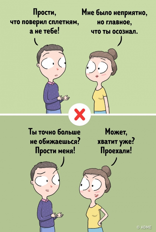 Вибачення дорослої людини припускають, що він виніс із свого вчинку урок на майбутнє. А вибачатися і продовжувати вести себе точно так само — абсолютно незріле і безглузде поведінка.