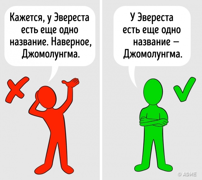 Намагайтеся не вживати «диски» слова, такі як «можливо», «напевно», «може». Ці слова залишають дірку у вашому аргументі і видають непевність. Опонент може зачепитися за це і обрушити вашу аргументацію. Дотримуйтеся конкретики, не йдіть в петляє демагогію, в ній неважко заблукати.