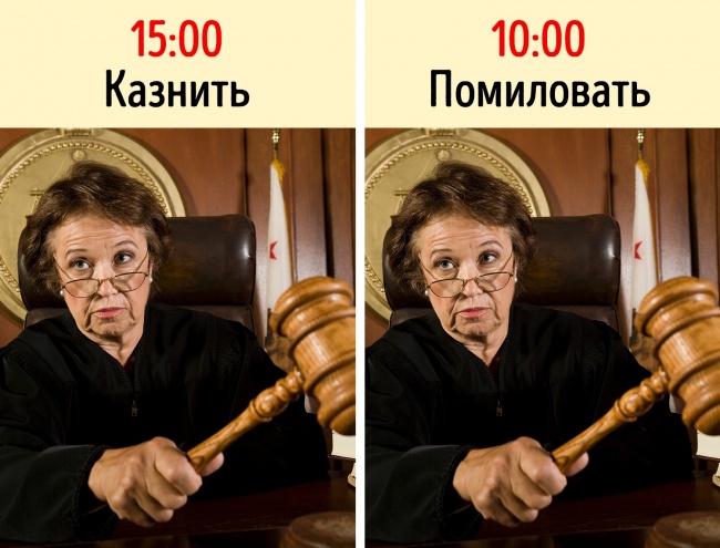 Суддя демократичніше і з великою увагою поставиться до тих обвинувачуваних, чиї справи про умовно-дострокове звільнення слухаються в ранкові години. Позитивне рішення приймалося в 70 % випадків у справах, які слухалися вранці, і в 10 % випадків у справах, які слухалися у другій половині дня. Це явище вчені назвали «втомою від прийняття рішень». Чим частіше доводиться робити вибір протягом дня, тим складніше дається мозку кожне нове прийняття рішення.