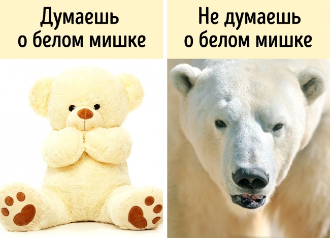 Висновки вчених та Федора Достоєвського, відчуло на собі досвід Льва Толстого: спробуйте не згадувати про білого ведмедя, і побачите, що він, проклятий, буде щохвилини припоминаться.