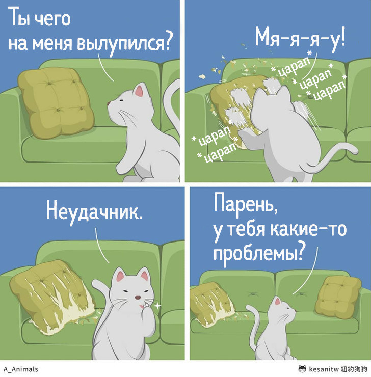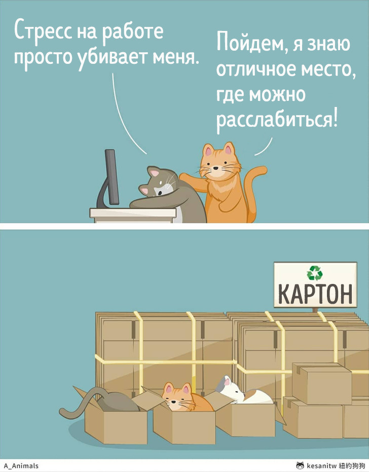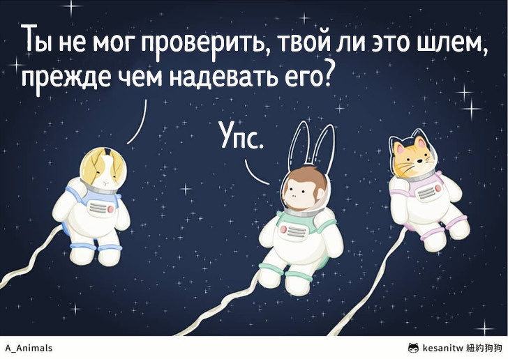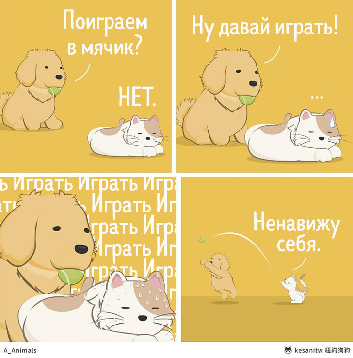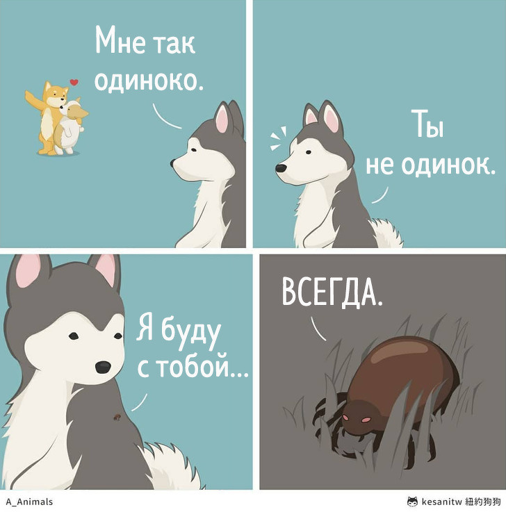 Життя у тварин куди більш насиченим, ніж думають люди. У наших пухнастих побратимів буває стрес, вони відчувають проблеми у спілкуванні і страждають від самотності. Про все це знає тайванський художник Алан Кесани (Alan Kesani). На своїх сторінках в Instagram і Facebook він регулярно публікує смішні і правдиві комікси. Вам не здається, що деякі ситуації ніби взяті з реального життя?